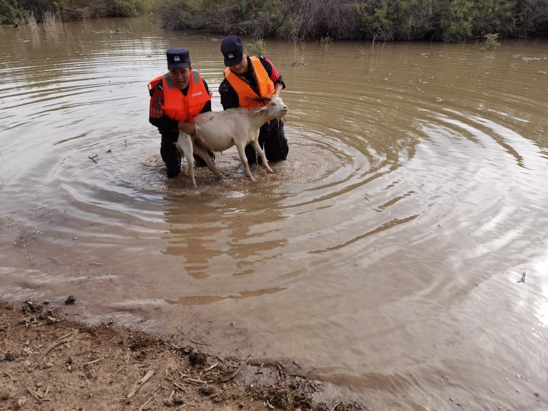 “請(qǐng)民警同志幫幫忙,我的羊群被困在河里了,這可是我的命根子?。 ?020年9月8日8時(shí)許,蘇泊淖爾邊境派出所一個(gè)報(bào)警電話打破了清晨的寧?kù)o,來電的是內(nèi)蒙古額濟(jì)納旗蘇泊淖爾蘇木牧民布某。原來,夜里黑河漲水,他家的幾十只羊被困,望著身陷險(xiǎn)境的羊群,焦急的布某打通了派出所的報(bào)警電話。