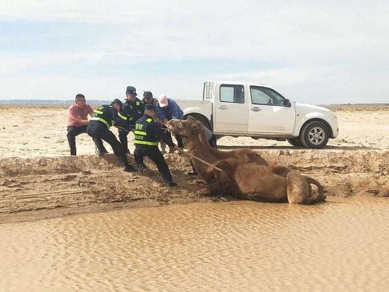 無獨(dú)有偶。當(dāng)日下午,阿拉善左旗蘇宏圖邊境派出所也接到群眾報(bào)警:稱其一峰駱駝陷入泥潭無法脫身,請(qǐng)求救助。民警趕到現(xiàn)場(chǎng)后發(fā)現(xiàn)這是一峰懷孕母駝,在飲水時(shí)不慎滑入泥潭,由于浸泡許久,已經(jīng)無法站立。民警當(dāng)即采取措施,在避免肚子受傷害的前提下,將兩條繩子分別固定在駱駝前肢與后肢,再利用人力拖拽,經(jīng)過2個(gè)小時(shí)的救援,成功將母駝救出。(牛鑫 梁鎮(zhèn) 于鶴偉)