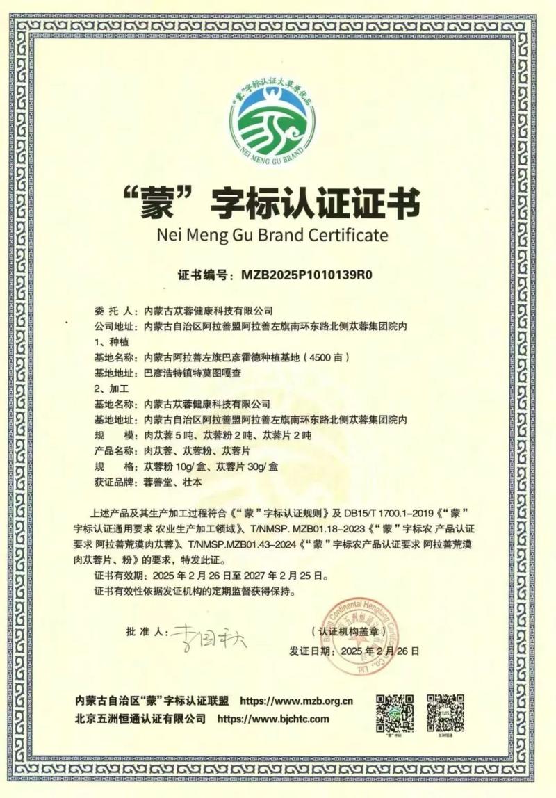 內(nèi)蒙古蓯蓉健康科技有限公司隸屬內(nèi)蒙古阿拉善蓯蓉集團(tuán)有限責(zé)任公司,主要負(fù)責(zé)肉蓯蓉種植基地建設(shè),以及肉蓯蓉食藥同源產(chǎn)品的生產(chǎn)與銷售。目前,公司已建成6萬畝高標(biāo)準(zhǔn)梭梭—肉蓯蓉高產(chǎn)穩(wěn)產(chǎn)示范基地,并獲評(píng)國家林下經(jīng)濟(jì)示范基地稱號(hào)。公司產(chǎn)品相繼通過有機(jī)產(chǎn)品認(rèn)證、中國森林認(rèn)證、生態(tài)原產(chǎn)地保護(hù)產(chǎn)品認(rèn)證、道地藥材認(rèn)證和7S道地保真管理體系認(rèn)證,全方位保障產(chǎn)品的生態(tài)有機(jī)特性與全程可追溯性。