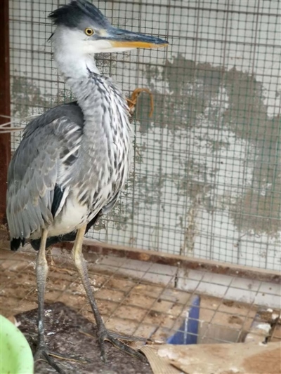 經(jīng)有經(jīng)驗(yàn)的民警辨認(rèn),這是一只蒼鷺幼鳥。這只鳥身高約70公分,長長的尖嘴,身著灰色體羽,頭戴深灰色羽冠,兩條大長腿格外顯眼,白色的前頸縱向排列著黑灰色條紋。民警聯(lián)系獸醫(yī)為其做了體檢,經(jīng)檢查,這只鳥并無傷病,可能是由于剛出窩飛行能力不強(qiáng)、捕食能力不足,造成體力虛弱。民警買來小魚,只見這只鳥狼吞虎咽享用起來,不久便精神十足,開始啄民警??吹剿w力開始恢復(fù),民警懸著的心也就放下了。民警計(jì)劃選擇合適時間和地方將其放飛。