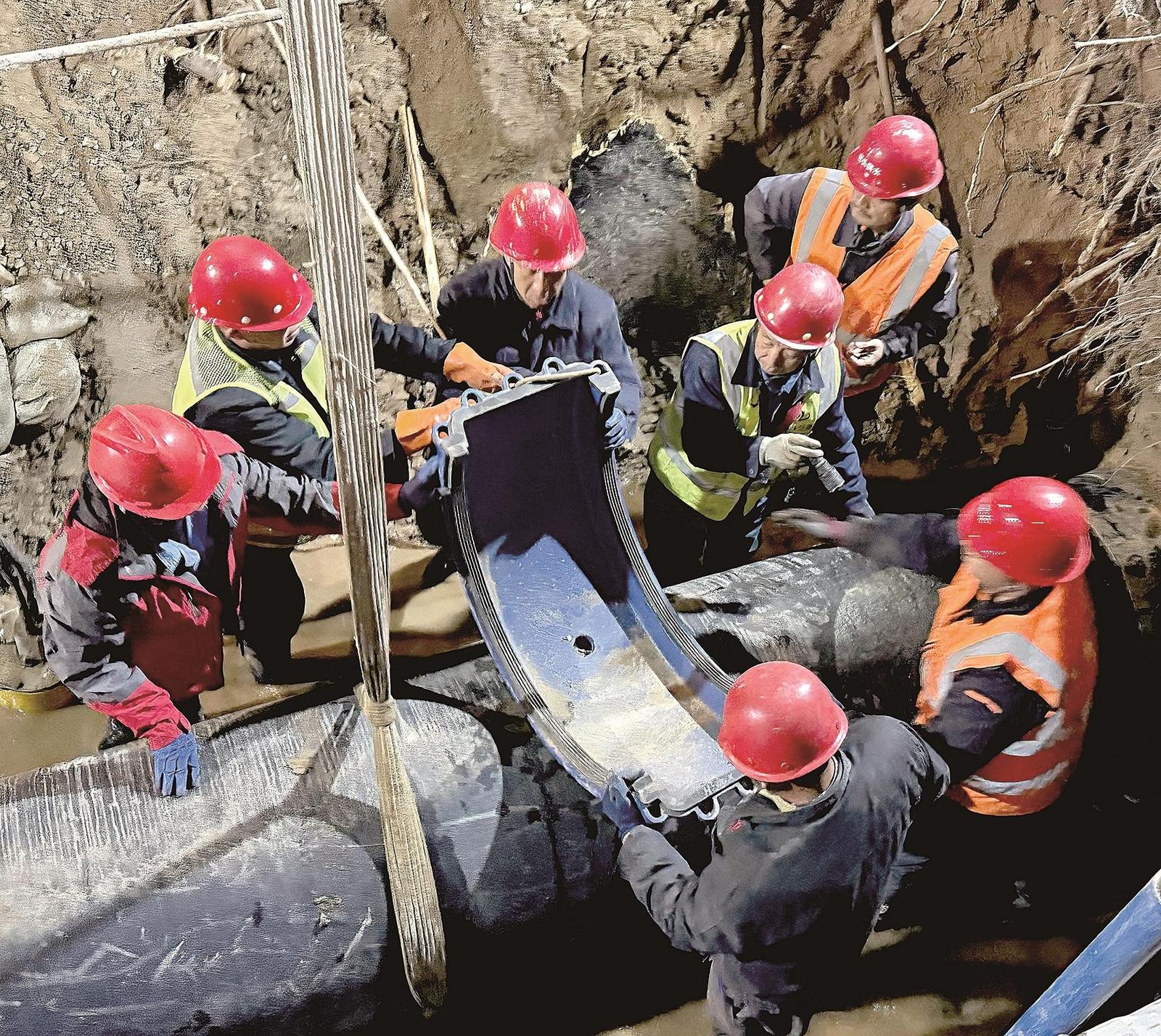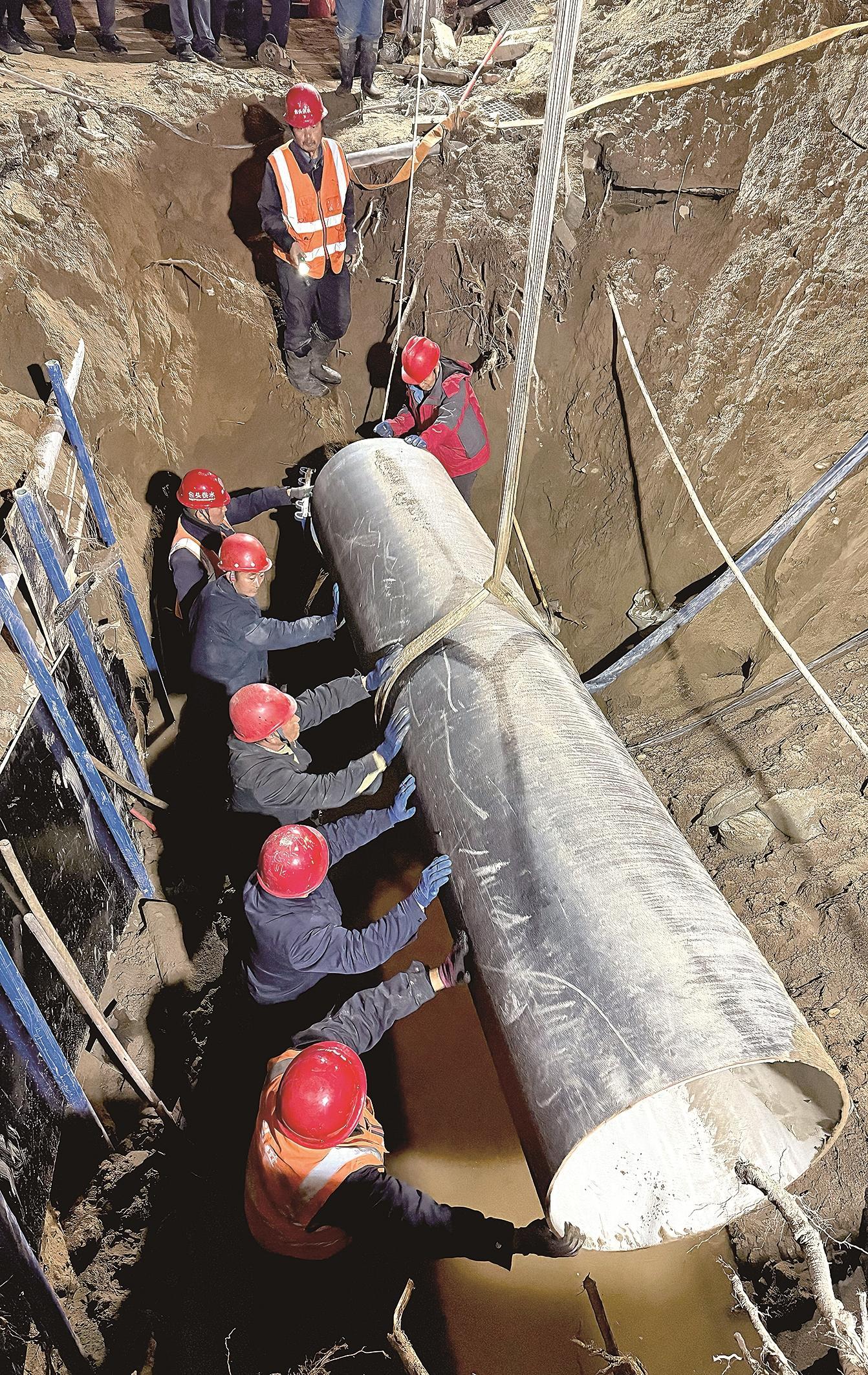 夜色漸深,氣溫持續(xù)下降,搶修現(xiàn)場卻燈火通明、熱火朝天。挖掘、排水、清理、焊接……每一個環(huán)節(jié)都爭分奪秒,井然有序。黨員干部沖鋒在前,帶頭跳入泥水中作業(yè);其他維修人員輪番上陣,困了就在工程車里瞇一會兒,餓了就蹲在路邊匆匆扒幾口盒飯。頂風冒雨的兩個日夜,他們心中只有一個信念:早一分鐘修復,市民就早一分鐘恢復正常用水,城市秩序就早一分鐘恢復。