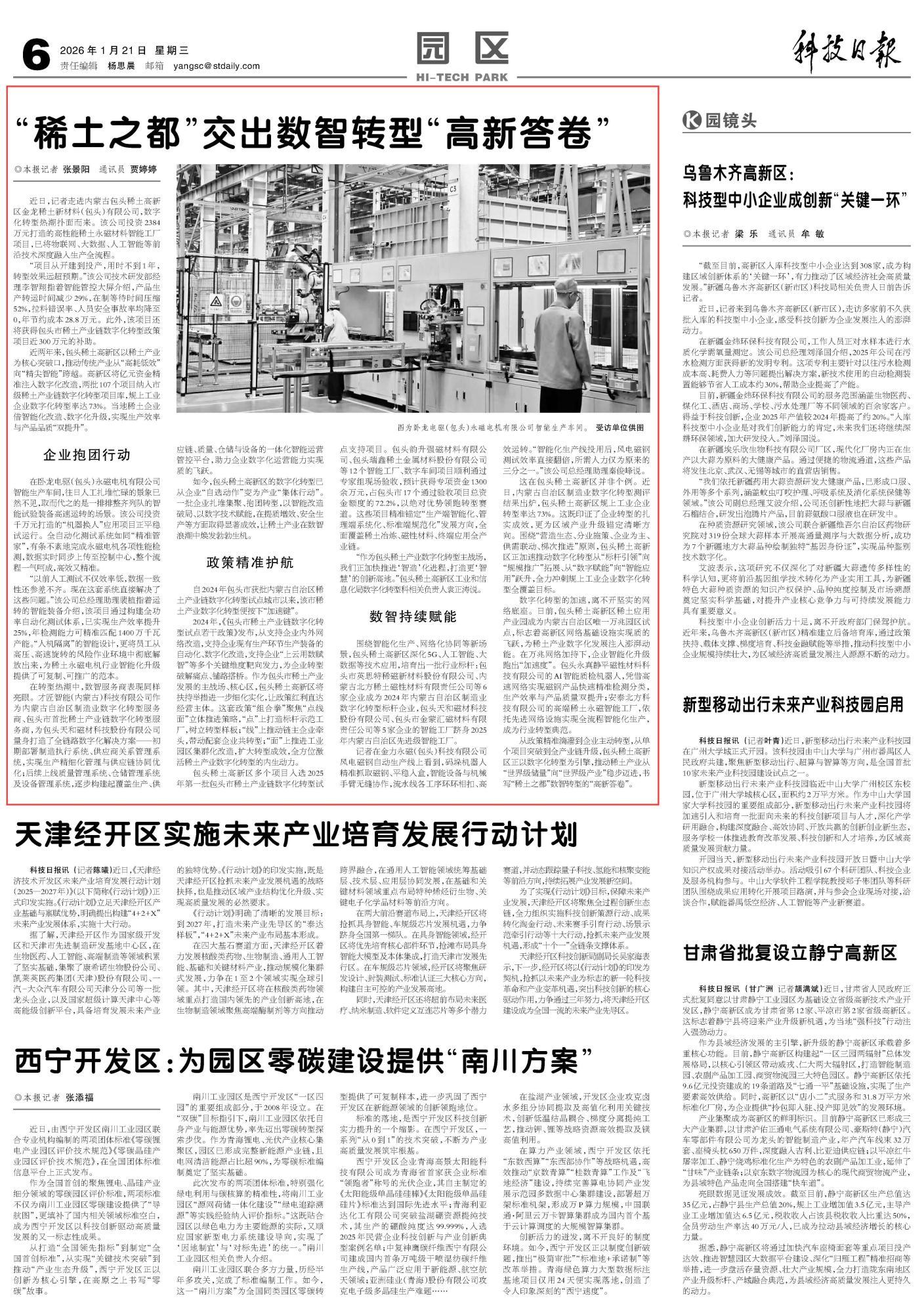 2026年1月21日《科技日報(bào)》第6版刊發(fā)了《“稀土之都”交出數(shù)智轉(zhuǎn)型“高新答卷”》的文章,報(bào)道了從政策精準(zhǔn)滴灌到企業(yè)主動轉(zhuǎn)型,從單個項(xiàng)目突破到全產(chǎn)業(yè)鏈升級,包頭稀土高新區(qū)正以數(shù)字化轉(zhuǎn)型為引擎,推動稀土產(chǎn)業(yè)從“世界級儲量”向“世界級產(chǎn)業(yè)”穩(wěn)步邁進(jìn),書寫“稀土之都”數(shù)智轉(zhuǎn)型的“高新答卷”。