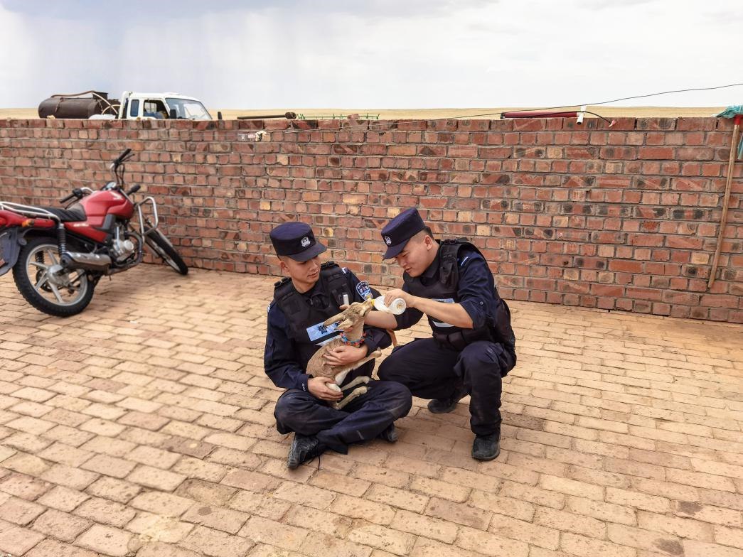 7月9日,甘其毛都邊境派出所民警與護(hù)邊員寶日夫在開展日常巡邊工作途中,發(fā)現(xiàn)一只受傷的黃羊幼崽伏在地上瑟瑟發(fā)抖。經(jīng)檢查,這只小黃羊年齡約為4個(gè)月,左后肢疑似扭傷,無(wú)法正常行走,身體也極為虛弱。民警立即將小黃羊帶到護(hù)邊員寶日夫家中包扎救治。寶日夫夫婦還為小黃羊做了一個(gè)項(xiàng)圈掛在脖子上,希望它盡快痊愈,茁壯成長(zhǎng)。