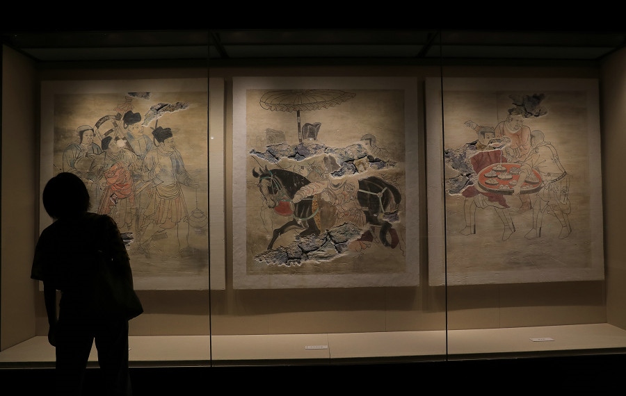游人在館內(nèi)參觀契丹墓葬壁畫