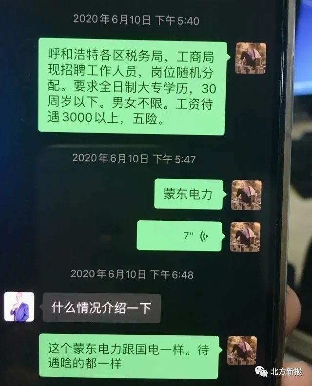 “呼和浩特各區(qū)消防大隊(duì)招聘辦公室內(nèi)勤人員,工資待遇3500元左右?!薄案咚俳痪羰兄ш?duì)(一支隊(duì))輔警,工資和五險(xiǎn)一金,4200元?!薄昂艉秃铺馗鲄^(qū)稅務(wù)局、工商局現(xiàn)招聘工作人員,崗位隨機(jī)分配?!薄昂艉秃铺貗D幼保健院招聘護(hù)士,大專學(xué)歷”……記者在民警繳獲的程某某的手機(jī)上看到,6月8日以來(lái),程某某和趙某某的聊天記錄中,發(fā)送了多條諸如此類的招聘信息。