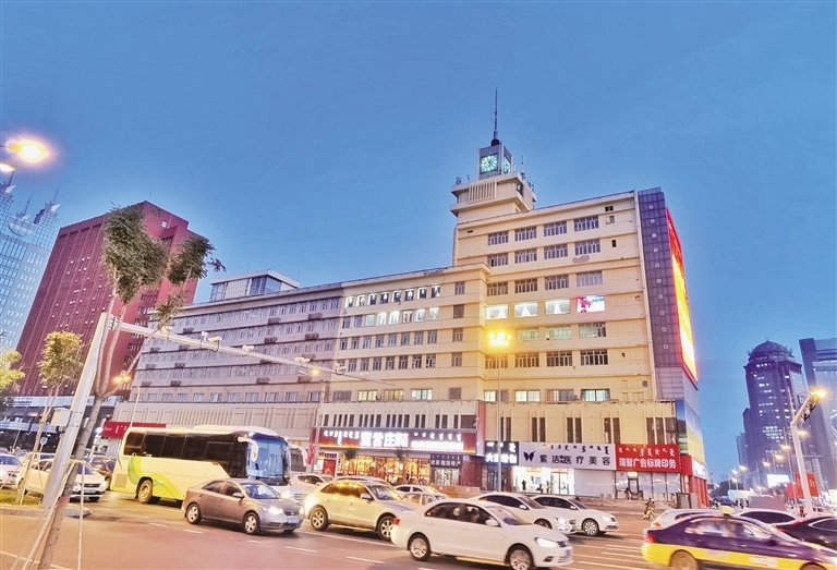 當日傍晚時分,天色漸暗,華燈初上,在斑斕的霓虹燈中,街道車水馬龍,人群熙熙攘攘,一派繁華都市的景象。這座建于1983年的景觀塔鐘,依然和30多年前一樣屹立在新華廣場東側(cè)的信息大廈樓頂,再次以“地標”姿態(tài)工作起來。
