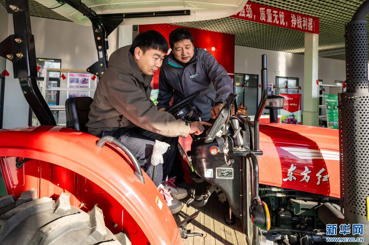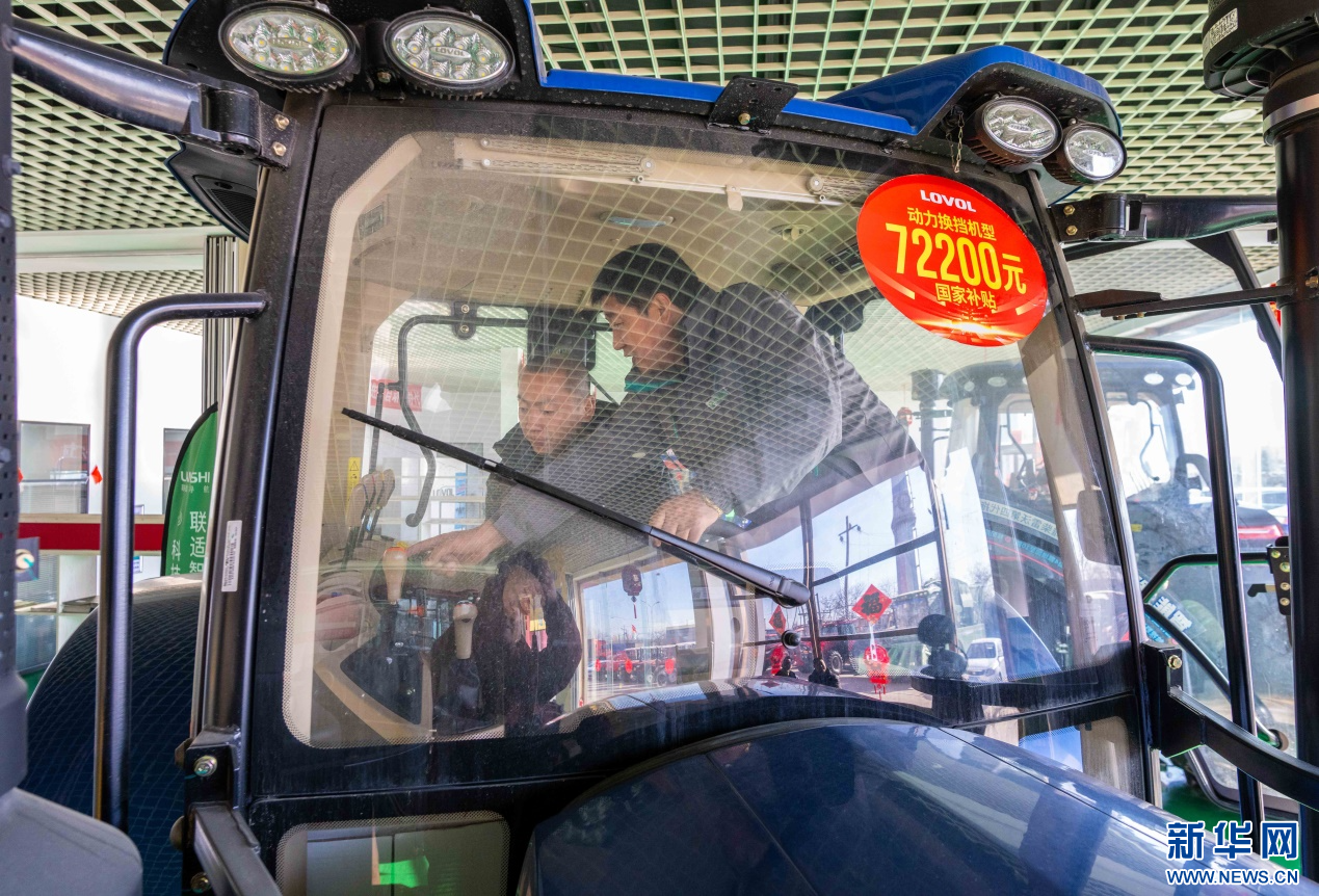 ??2月18日,在位于呼和浩特市玉泉區(qū)的一家農(nóng)機(jī)設(shè)備公司展銷大廳,農(nóng)戶在試駕拖拉機(jī)。新華網(wǎng)發(fā)(丁根厚 攝)