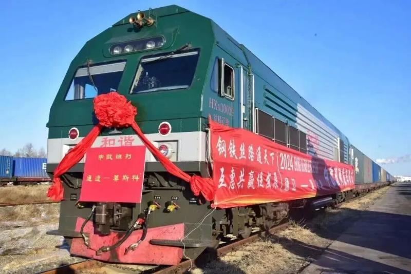 滿載55個(gè)集裝箱貨物的中歐班列從通遼駛向莫斯科。圖片來源通遼市融媒體中心微信公眾號