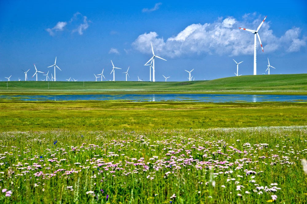 “輝騰錫勒”蒙古語意為“清涼的山崗”,因風(fēng)力資源豐富而得名,是建設(shè)風(fēng)電場理想的場所。如今,一排排風(fēng)電機(jī)猶如“白色森林”,碩大的風(fēng)翼就像一架架“大風(fēng)車”,在草原勁風(fēng)吹動下緩緩轉(zhuǎn)動,形成另一大景觀。