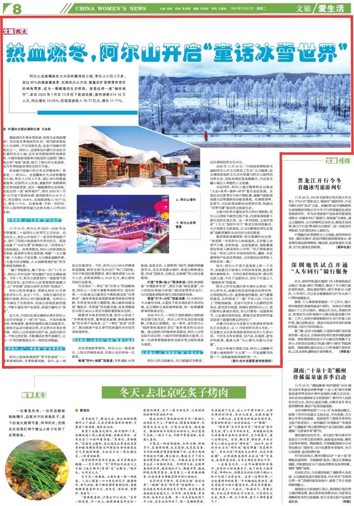 2025年12月2日,《中國婦女報》第8版刊發(fā)題為《熱血燃冬,阿爾山開啟“童話冰雪世界”》的新聞,報道了阿爾山,這座地處內(nèi)蒙古自治區(qū)興安盟的東北小城,近年來憑借獨特的地理優(yōu)勢、豐富的旅游資源和當(dāng)?shù)卣穆貌块T精心推出的“寵客”政策,吸引了國內(nèi)外大批游客,成為冬季體驗冰雪快樂的打卡地。