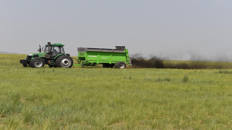 在退化放牧場治理區(qū),施工人員用推土機推平坑洼不平的風蝕坑、整理棄土堆;按照噴幅寬6~8米的行距,用拋肥機將牛羊固態(tài)糞肥和含有氮、磷、鉀等生物有機液態(tài)肥拋灑在草場上,增加土壤肥力;用切根機將稀疏的羊草切開、促進分蘗繁殖、復壯,增加種群密度;采用栽設4×4米網格狀沙幛、覆蓋草簾來降溫保墑抗旱保苗,與此同時與項目區(qū)牧戶簽訂三年的禁牧、生態(tài)補償、管護協(xié)議。