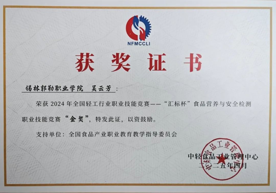 2025年4月21日,由中國(guó)輕工業(yè)聯(lián)合會(huì)、中輕食品工業(yè)管理中心、全國(guó)食品產(chǎn)業(yè)職業(yè)教育教學(xué)指導(dǎo)委員會(huì)等聯(lián)合舉辦的2024年全國(guó)輕工行業(yè)職業(yè)技能競(jìng)賽——“匯標(biāo)杯”食品營(yíng)養(yǎng)與安全檢測(cè)職業(yè)技能競(jìng)賽總決賽在廣州圓滿落幕。錫林郭勒職業(yè)學(xué)院食品檢測(cè)中心總工程師吳云芳同志榮獲金獎(jiǎng)。