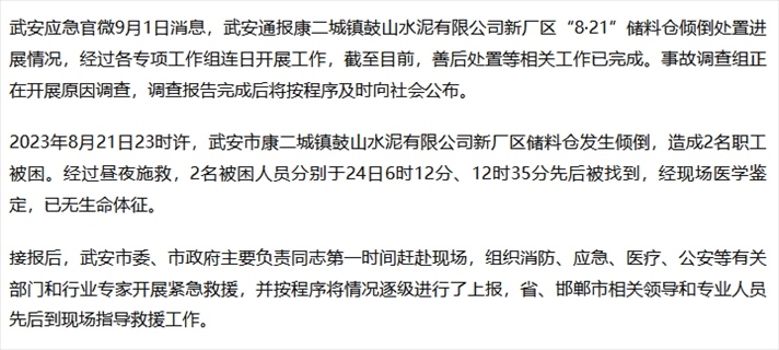 ·河北武安:一水泥廠儲(chǔ)料倉(cāng)發(fā)生傾倒致兩人死亡。