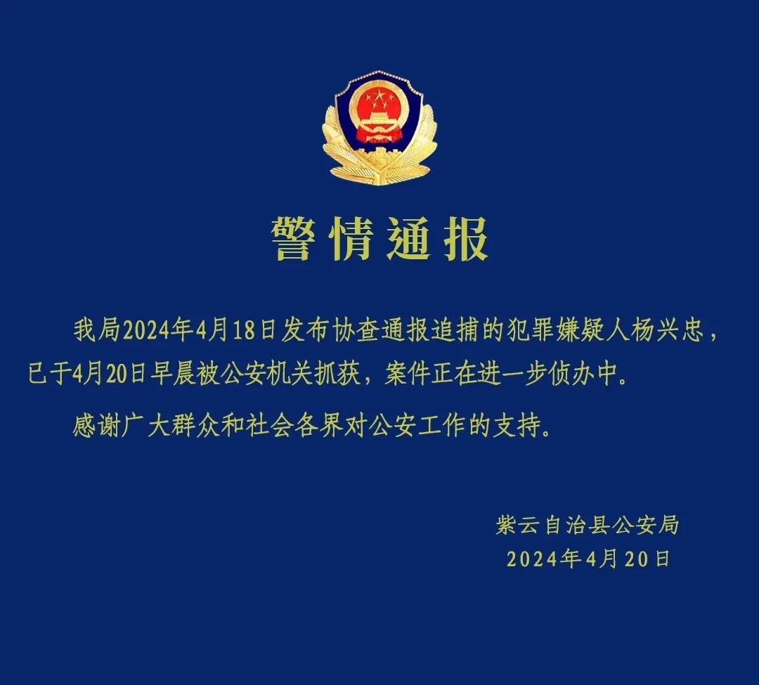 央視網消息:據“紫云公安”官微消息,紫云自治縣公安局4月18日發(fā)布協查通報追捕的犯罪嫌疑人楊興忠,已于4月20日早晨被公安機關抓獲,案件正在進一步偵辦中。