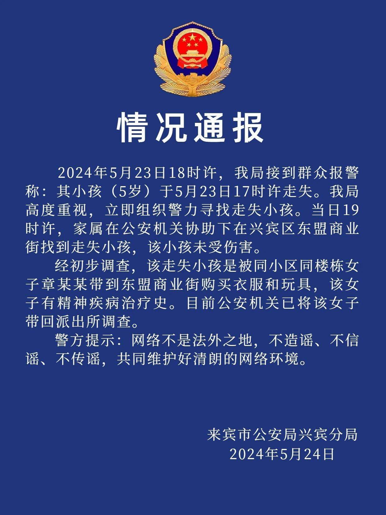 央視網(wǎng)消息:據(jù)“興賓公安”微信公眾號消息,廣西壯族自治區(qū)來賓市公安局興賓分局通報,2024年5月23日18時許,興賓分局接到群眾報警稱:其小孩(5歲)于5月23日17時許走失。興賓分局高度重視,立即組織警力尋找走失小孩。當(dāng)日19時許,家屬在公安機(jī)關(guān)協(xié)助下在興賓區(qū)東盟商業(yè)街找到走失小孩,該小孩未受傷害。