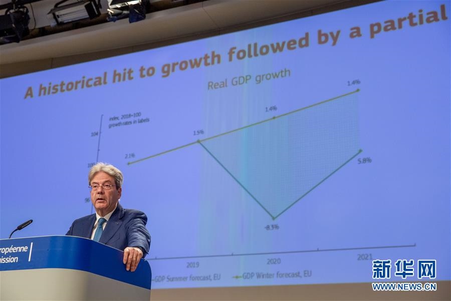 這是7月7日,負責經(jīng)濟事務的歐委會委員保羅·真蒂洛尼在位于比利時布魯塞爾的歐盟委員會總部就歐盟經(jīng)濟預測出席新聞發(fā)布會。歐盟7日發(fā)布夏季經(jīng)濟預測報告說,由于放松新冠疫情防控措施的步伐比原計劃緩慢,歐盟和歐元區(qū)今年經(jīng)濟萎縮程度將比此前預期更嚴重,明年復蘇也將更緩慢。新華社發(fā)(歐盟供圖)