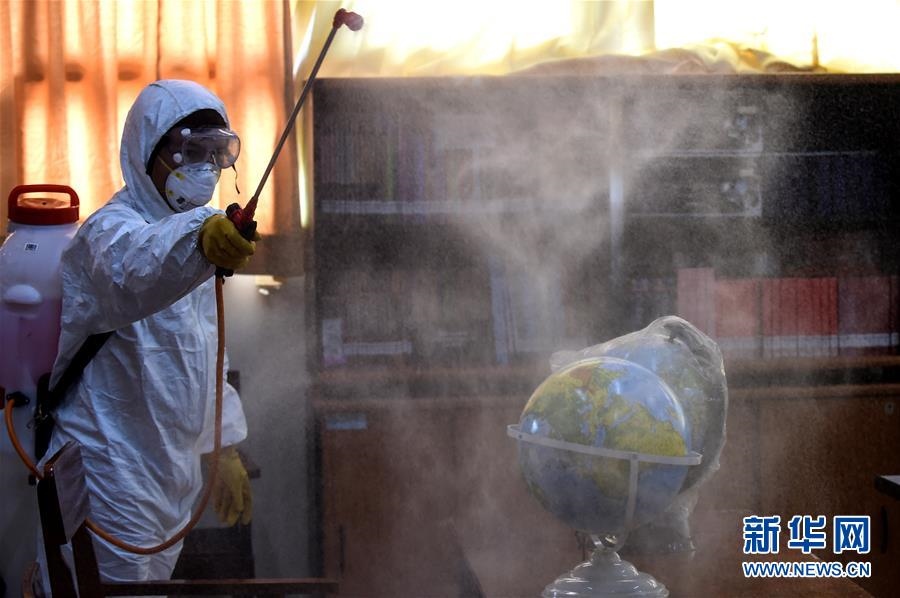 3月20日,工作人員在印度尼西亞雅加達的一所學校進行消毒。新華社發(fā)(阿貢攝)