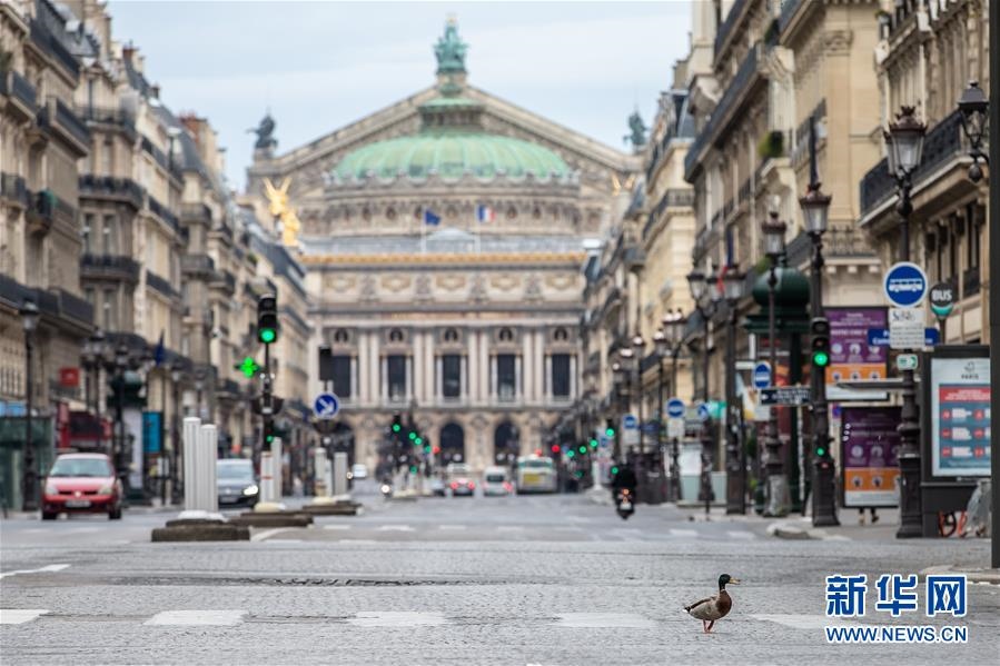 這是4月6日,在法國巴黎,一只鴨子在巴黎歌劇院前的大道上“溜達”?!敖懔睢睂嵤┢陂g,不少動物“溜達”到巴黎空蕩無人的大街上。新華社發(fā)(奧雷利安·莫里薩爾攝)