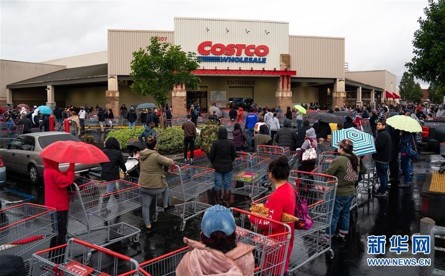這是3月14日,在美國洛杉磯一家超市外,民眾冒雨排隊等候開門購物。新華社發(fā)(錢衛(wèi)忠攝)