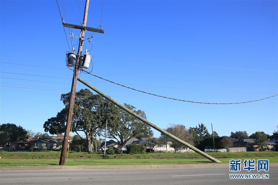 這是10月29日在美國路易斯安那州新奧爾良拍攝的颶風(fēng)“澤塔”刮歪的電線桿。新華社發(fā)(魏蘭攝)