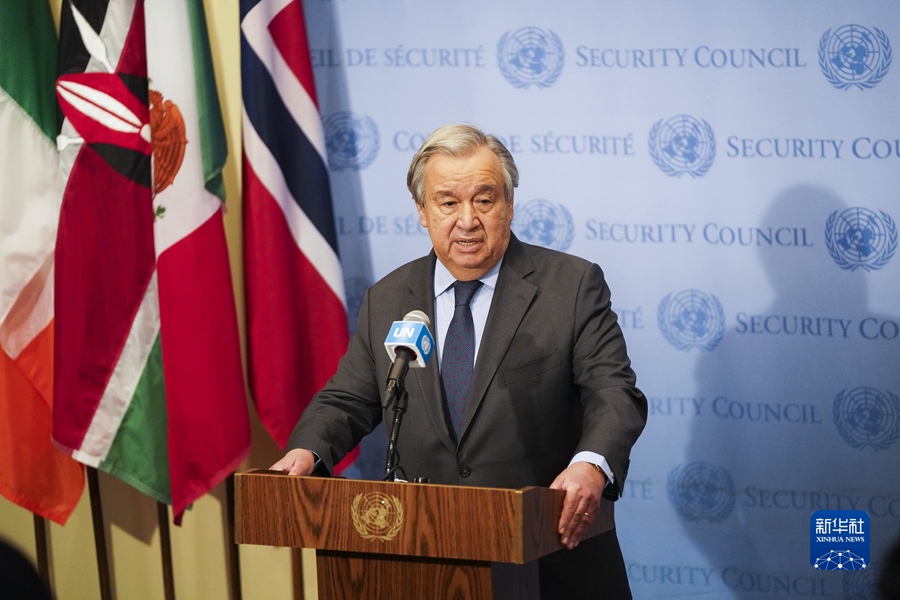 2月23日,在紐約聯(lián)合國總部,聯(lián)合國秘書長古特雷斯在安理會審議烏克蘭問題緊急會議結(jié)束后講話。 新華社記者 王迎 攝
