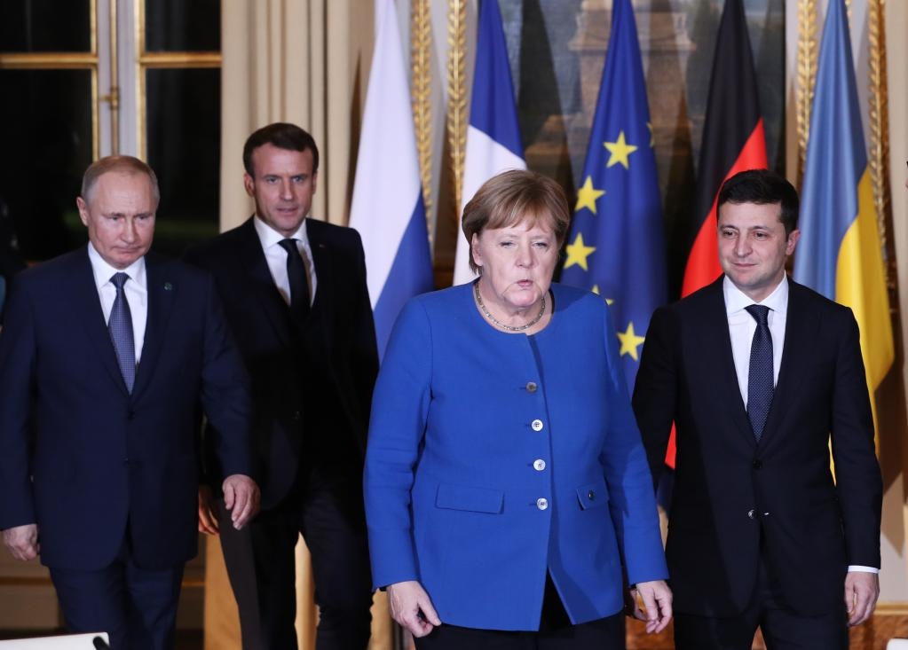 2019年12月9日,在法國巴黎,(從左到右)俄羅斯總統(tǒng)普京、法國總統(tǒng)馬克龍、時任德國總理默克爾和烏克蘭總統(tǒng)澤連斯基出席“諾曼底模式”四國峰會。(新華社記者高靜攝)