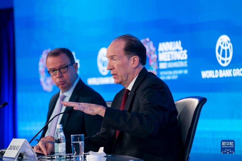 10月13日,在美國(guó)首都華盛頓,世界銀行行長(zhǎng)馬爾帕斯(右)在記者會(huì)上發(fā)言。新華社記者 劉杰 攝