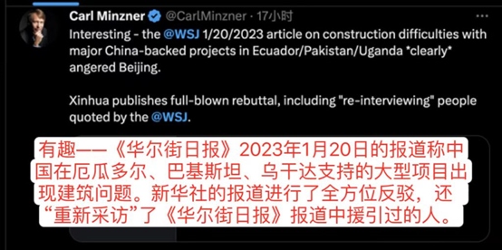美國福特漢姆大學(xué)教授、美國外交關(guān)系協(xié)會中國問題高級研究員明克勝轉(zhuǎn)發(fā)了新華社的報道,并稱:有趣——《華爾街日報》2023年1月20日的報道稱中國在厄瓜多爾、巴基斯坦、烏干達(dá)支持的大型項目出現(xiàn)建筑問題。新華社的報道進(jìn)行了全方位反駁,還“重新采訪”了《華爾街日報》報道中援引過的人。