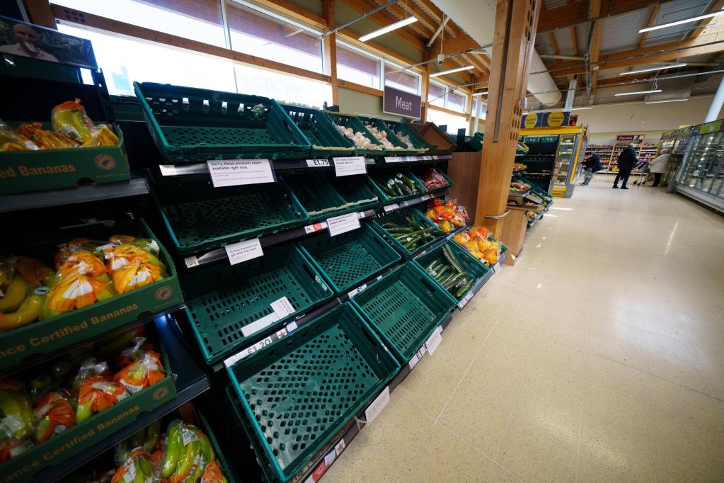 2月23日,在英國曼徹斯特,一家超市的水果和蔬菜貨架出現缺貨。新華社發(fā)(喬恩·休珀攝)