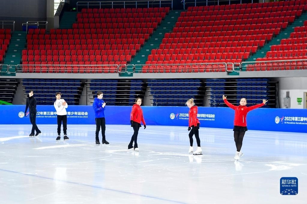 在長(zhǎng)春五環(huán)體育館,參加第三屆中俄冬季青少年運(yùn)動(dòng)會(huì)的俄羅斯花樣滑冰運(yùn)動(dòng)員在賽前場(chǎng)地適應(yīng)性訓(xùn)練時(shí)向場(chǎng)邊的中國(guó)運(yùn)動(dòng)員致意(2022年12月15日攝)。新華社記者 許暢 攝