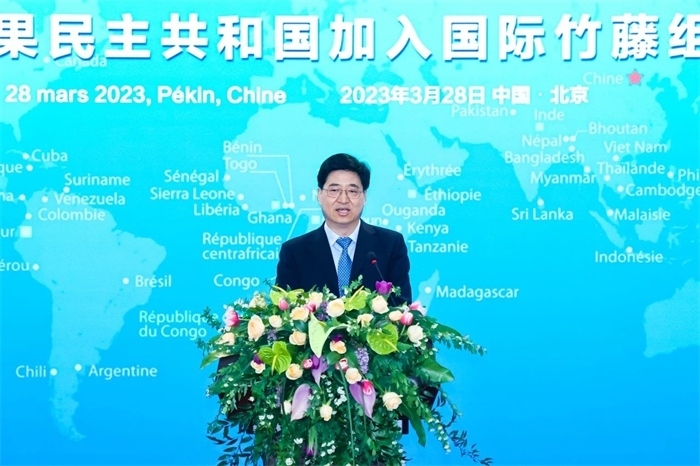 國際竹藤組織理事會主席、喀麥隆林業(yè)和野生動(dòng)物部部長恩東戈·朱爾·多雷,國際竹藤組織董事會聯(lián)合主席江澤慧,中國外交部國際經(jīng)濟(jì)司參贊張雷,中國國家林業(yè)和草原局副局長譚光明,乍得共和國駐華使館代辦馬魯米,剛果民主共和國農(nóng)業(yè)部部長姆津加·比利漢澤·德西雷出席并致辭。