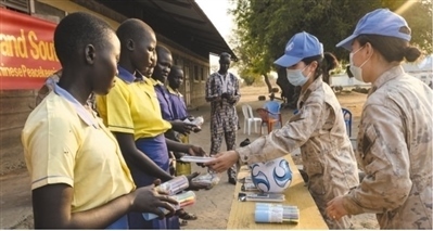 中國第九批赴南蘇丹(朱巴)維和步兵營長巡分隊官兵在丹蒙加拉為當(dāng)?shù)貎和浰臀捏w用品。 中國赴南蘇丹(朱巴)維和步兵營供圖