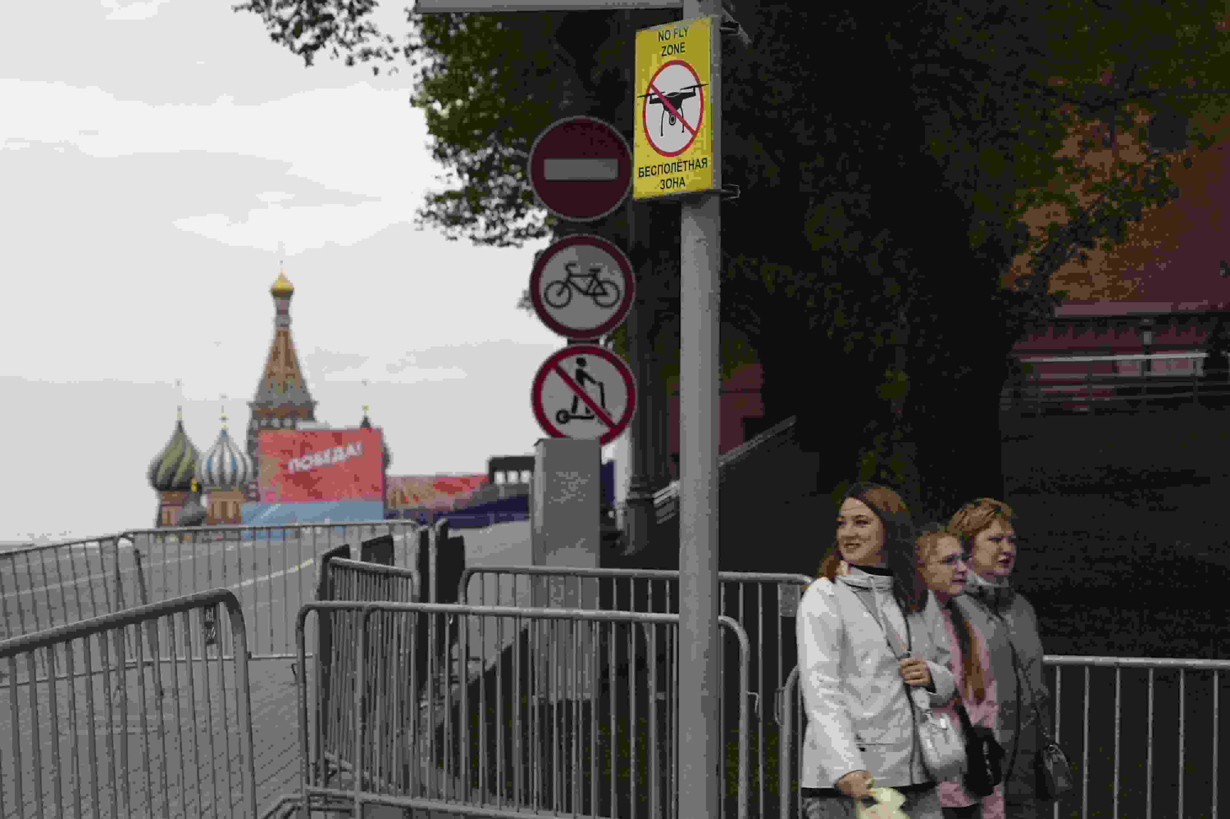 當(dāng)?shù)貢r間2023年5月3日,俄羅斯莫斯科,莫斯科市中心懸掛的“無人駕駛飛機(jī)禁飛區(qū)”的標(biāo)志,禁止無人機(jī)在該地區(qū)飛行??死锬妨謱m遭無人機(jī)襲擊后,莫斯科市長宣布禁止未經(jīng)授權(quán)的無人機(jī)在俄羅斯首都上空飛行。 視覺中國