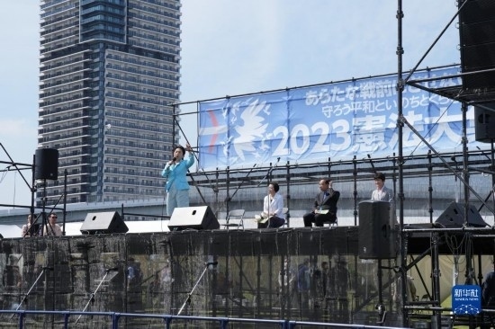 5月3日,在日本東京有明防災公園的廣場上,在野黨社民黨黨首福島瑞穗在集會上發(fā)表演講。新華社記者 張笑宇 攝