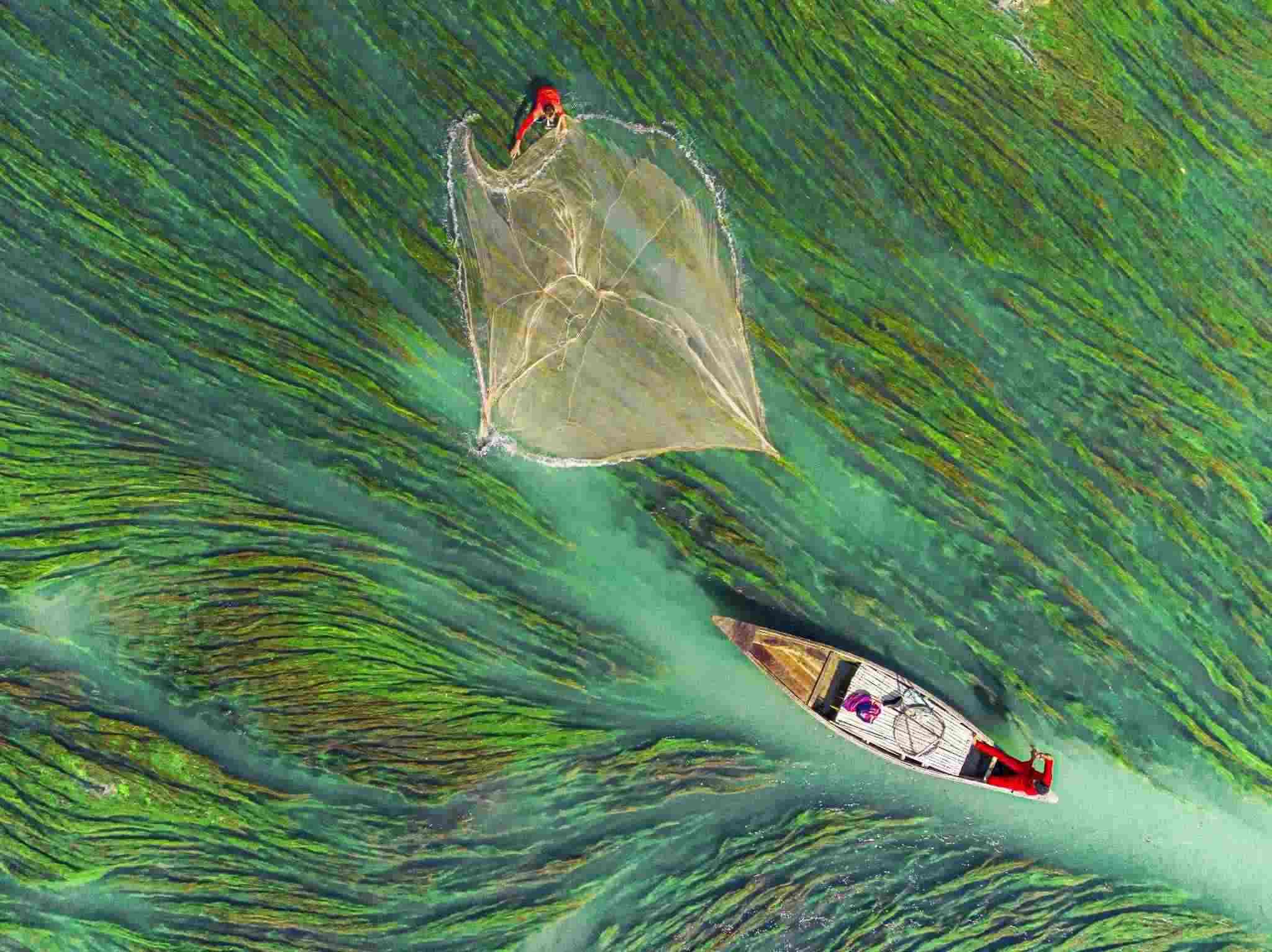 孟加拉拉杰沙希,漁民在河中撒網(wǎng)捕魚,周圍被多彩的水藻包圍。視覺(jué)中國(guó)