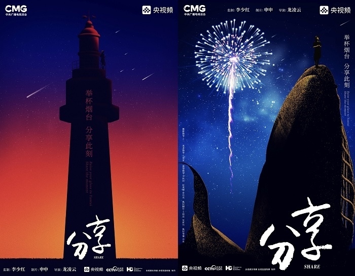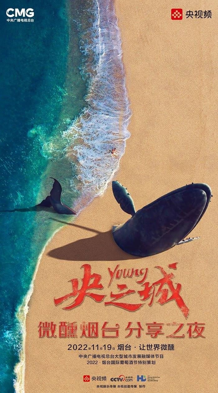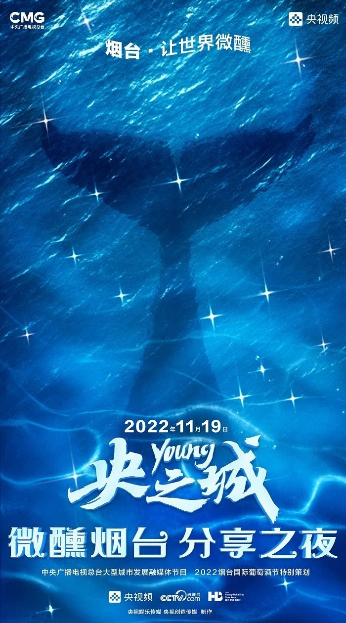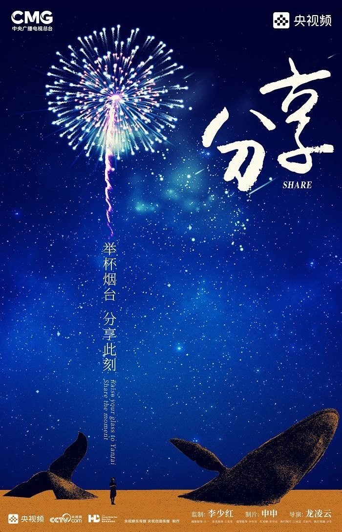 田雨峰在拍攝短片海報用圖的時候,首先確定了畫面中最突出的形象元素,同時也是交代短片故事發(fā)生地的地標性雕塑——“孤獨的鯨“。這個雕塑如今是煙臺開發(fā)區(qū)金沙灘的網紅打卡地,網友為其起名”鯨落“。碩大的鯨魚從淺海處躍出海面,魚頭和魚尾凌空飛躍,其身體的一部分似藏在沙灘里。這是一個在真實生活中不會出現(xiàn)的景象,充滿了動畫般的奇幻想象,位于煙臺碧藍的海邊,又天然地帶上了一點浪漫的色彩。短片中”舉杯煙臺,分享此刻“的Slogan綴在尾聲,分享的正是煙臺這座城市獨有的沙灘、夜空、煙火和人間。短片中可以娓娓道來般逐漸交代,但在海報里,二環(huán)用畫面底部金色沙灘上”孤獨的鯨“,畫面上方如大海般湛藍的星空,星空中綻放的煙花,鎖定了地球上唯一的煙臺。田雨峰鏡頭中短片主角的人物照被二環(huán)拼貼到童話般色彩斑斕的畫面里,被著意縮小了的黑色小女孩于是成為一切奇幻、浪漫想象的迸發(fā)之源,和世界分享一個妙趣橫生的想法。