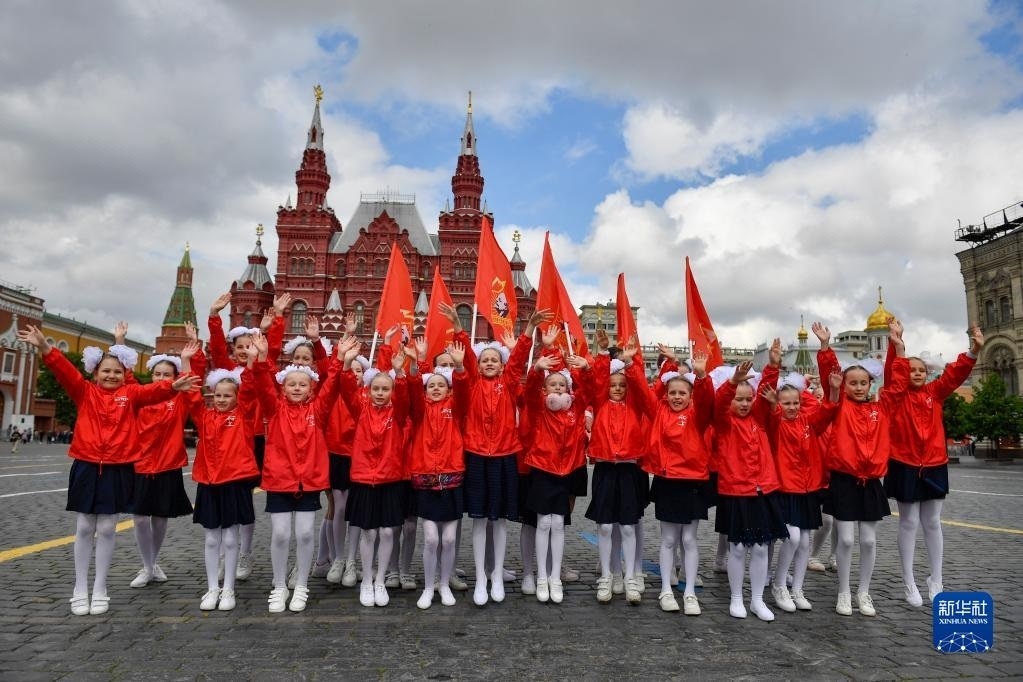 5月21日,在俄羅斯首都莫斯科,孩子們在少先隊入隊儀式上表演。