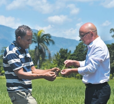中國農業(yè)專家(右)和當地專家在多米尼加國家水稻培訓中心討論水稻種植問題。 新華社記者 朱婉君攝