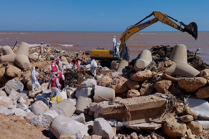 △救援人員正在德爾納市海濱進(jìn)行搜救工作