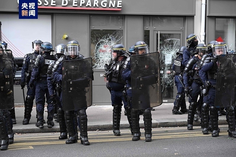 在法國首都巴黎,游行隊伍下午3點左右從北站平靜出發(fā)后,隨后一個由數百名蒙面男子組成的隊伍破壞了銀行機構的櫥窗,并向一輛警車投擲石塊。巴黎警察局稱,這輛汽車遭到“鐵棍”的打擊。車上一名警察手持武器下車,以便與示威者保持距離。一支摩托車警察部隊隨后趕來,阻止了破壞行為并保護了車上的警察。