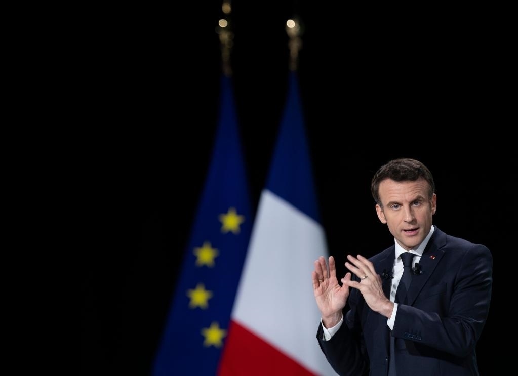 2022年3月17日,法國(guó)總統(tǒng)馬克龍?jiān)诎屠璞苯既{-圣但尼省舉行的新聞發(fā)布會(huì)上介紹競(jìng)選綱領(lǐng)。新華社發(fā)(肖恩·洛朗攝)
