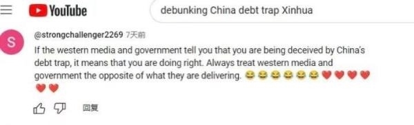 網(wǎng)友“強(qiáng)力挑戰(zhàn)者2269”直言:“如果西方政府和媒體告訴你,你陷入了中國的‘債務(wù)陷阱’,那證明你做對了。對待西方媒體和政府宣傳的信息,你得反著看?!?/p>