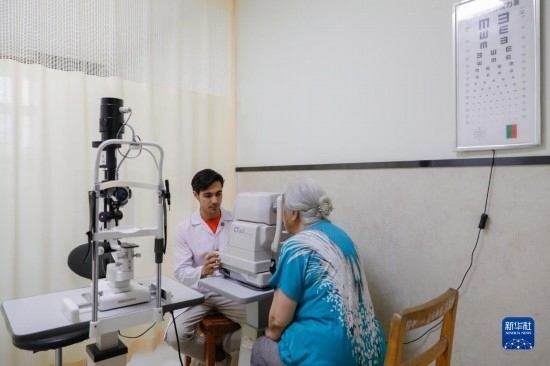 甘肅中醫(yī)藥大學(xué)針灸推拿專業(yè)的土庫(kù)曼斯坦留學(xué)生迪達(dá)(左)在臨床實(shí)習(xí)中為患者檢查眼睛(7月28日攝)。新華社記者 方欣 攝
