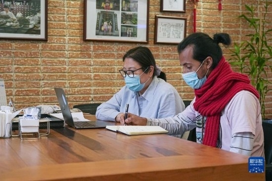 7月27日,在巴西圣保羅,中巴中醫(yī)藥國(guó)際合作中心負(fù)責(zé)人方芳(左)與同事參加視頻會(huì)議。新華社發(fā)(保羅·洛佩斯 攝)