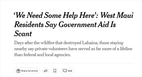 《紐約時(shí)報(bào)》8月13日發(fā)表報(bào)道稱,毛伊島野火造成2200多幢建筑倒塌,許多受災(zāi)居民缺少熱食、飲用水和庇護(hù)所。災(zāi)難發(fā)生后,當(dāng)?shù)刂驹刚呓M成了比聯(lián)邦和地方機(jī)構(gòu)更可靠的“生命線”。有居民表示,從聯(lián)邦和地方政府手中得到的救助遠(yuǎn)沒有從私人志愿者處得到的多。