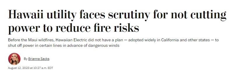 據(jù)《華盛頓郵報(bào)》8月12日?qǐng)?bào)道,三家法律公司已代表受害者對(duì)夏威夷電氣公司提起集體訴訟,指控該公司未在強(qiáng)風(fēng)天氣來臨前切斷供電。該公司下屬的一個(gè)變電站8日曾出現(xiàn)電線倒塌事故,事發(fā)地點(diǎn)靠近最初起火點(diǎn)。