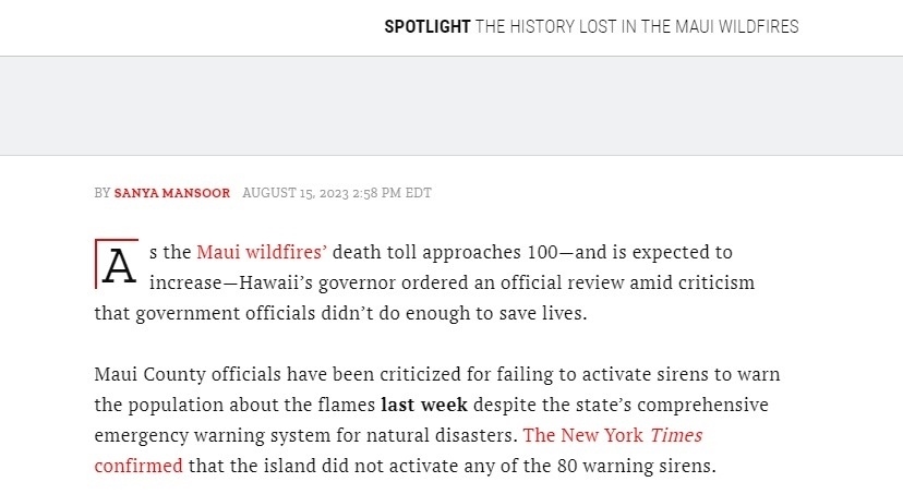 據(jù)悉,夏威夷毛伊島部署有80個(gè)警報(bào)器,但是在此次野火來襲過程中,警報(bào)器并未響起。安達(dá)亞16日曾表示,他并不后悔沒有拉響警報(bào)器,因?yàn)榫瘓?bào)器通常是用來警示海嘯的,反而可能導(dǎo)致很多民眾逃向內(nèi)陸地勢(shì)較高處,從而進(jìn)入火海。這一表態(tài)激起了廣泛爭(zhēng)議和批評(píng)。