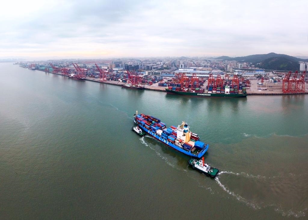 在福建自貿(mào)區(qū)廈門片區(qū)東渡港區(qū),一艘貨輪向碼頭靠攏(2017年8月26日無人機照片)。(新華社記者姜克紅攝)