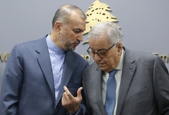 10月13日,伊朗外長阿卜杜拉希揚(左)和黎巴嫩外長哈比卜在黎巴嫩首都貝魯特出席記者會。新華社記者劉宗亞攝