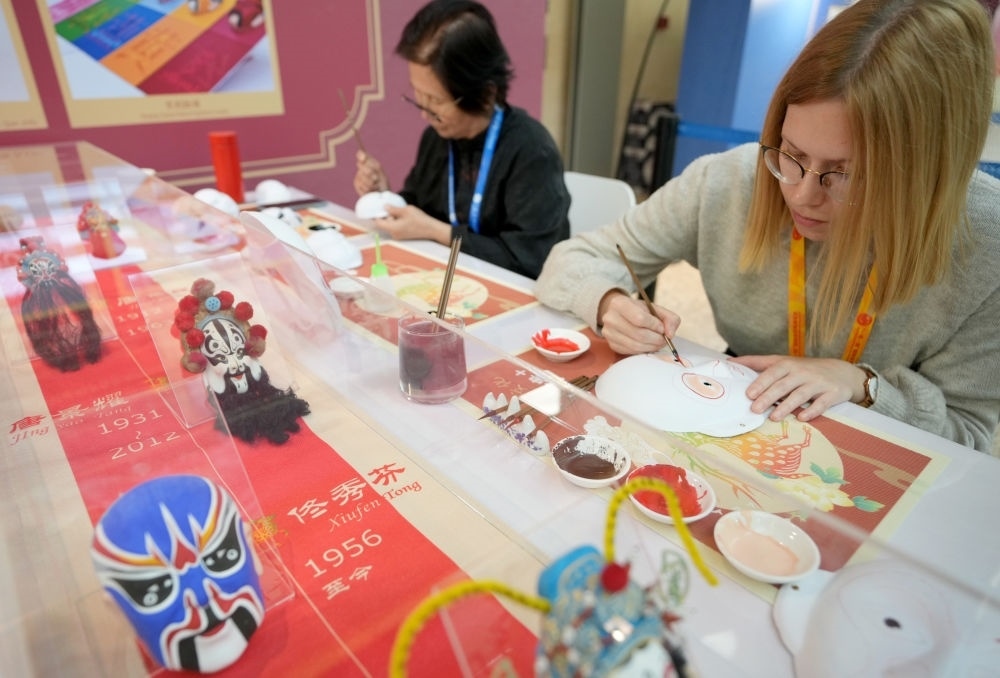 10月16日,在第三屆“一帶一路”國際合作高峰論壇新聞中心,來自比利時的記者(右)體驗畫京劇臉譜。新華社記者 王毓國 攝